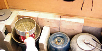 焙煎風景(右の二つは備長炭の消し壷)焙煎中に火の通りが悪い豆(くず豆)をチェックして取り除きます。この作業は機械焙煎ではできない手作業ならではのこだわりです。